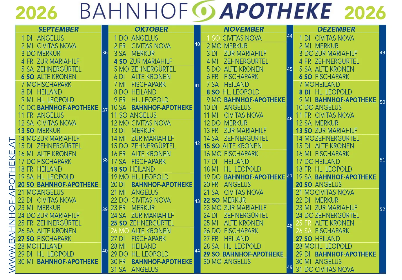 Die Bahnhof-Apotheke Schöberl & Herget OG ist für Sie bereit, auch außerhalb der üblichen Öffnungszeiten. Gemeinsam mit anderen Apotheken aus der Umgebung bieten wir als Bereitschaftsapotheke unsere Dienste auch nachts, an Wochenenden und Feiertagen an. Auf diese Weise gewährleisten wir die ständige Verfügbarkeit von Medikamenten und medizinischen Präparaten.